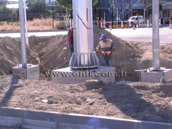 التركيب : تركيب الأساس الذي سيتصل العمود من خلاله بالأرض يمكن أن يجري يدوياً بالنسبة للأعمدة الصغيرة، أما فيما يتعلق بالأعمدة الكبيرة فيمكن أن يحتاج العمل إلى الإستعانة برافعة